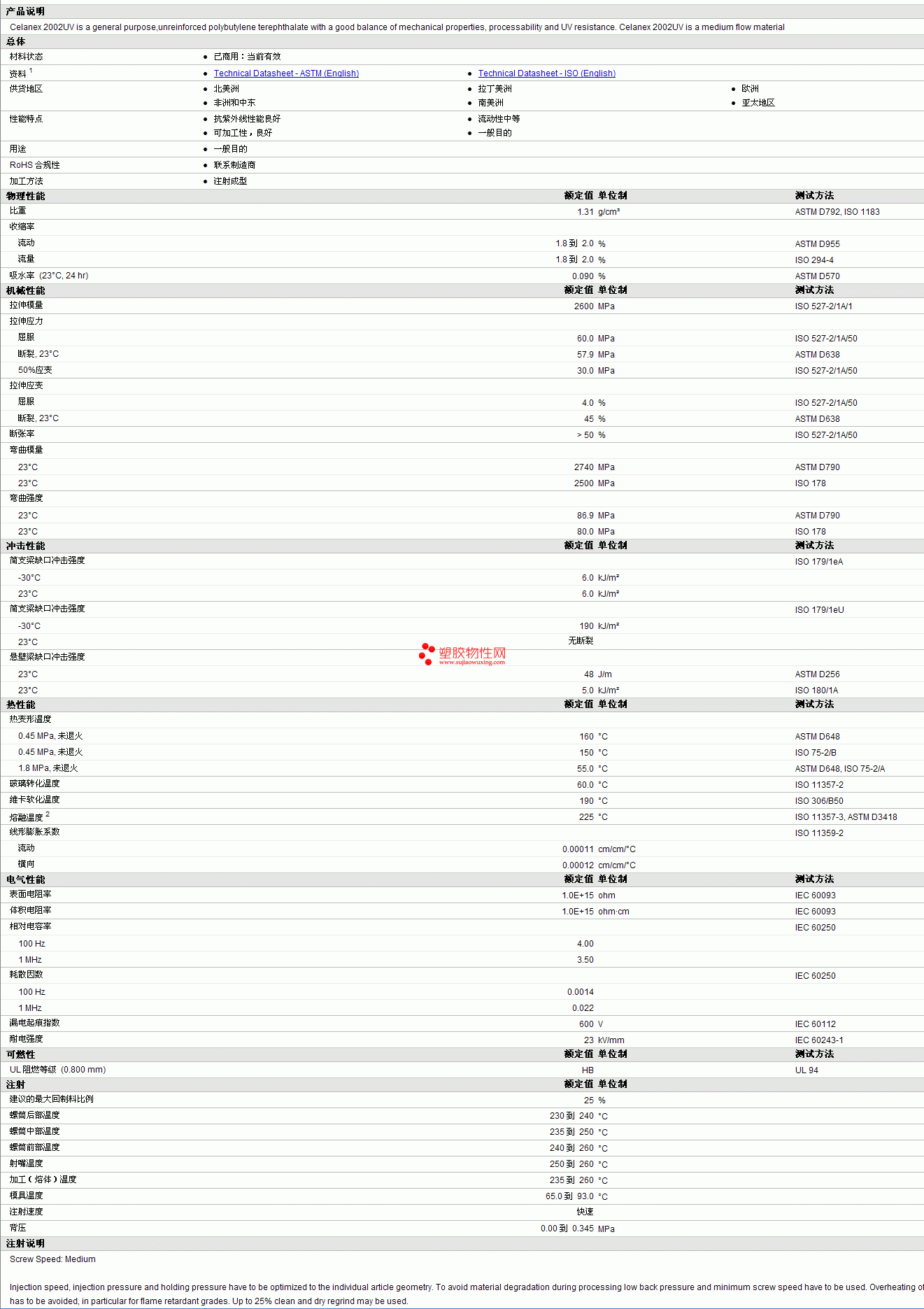 如需了解Celanex pbt 2002UV物性表更多详情,ROHS(SGS)报告、、材质证明、UL黄卡等,最新行情报价等可来电咨询:赵先生:13424755533 QQ:27660005