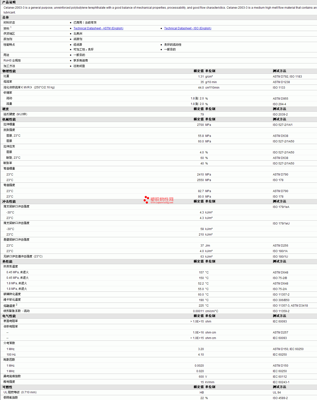 如需了解Celanex pbt 2003-3物性表更多详情,ROHS(SGS)报告、、材质证明、UL黄卡等,最新行情报价等可来电咨询:赵先生:13424755533 QQ:27660005