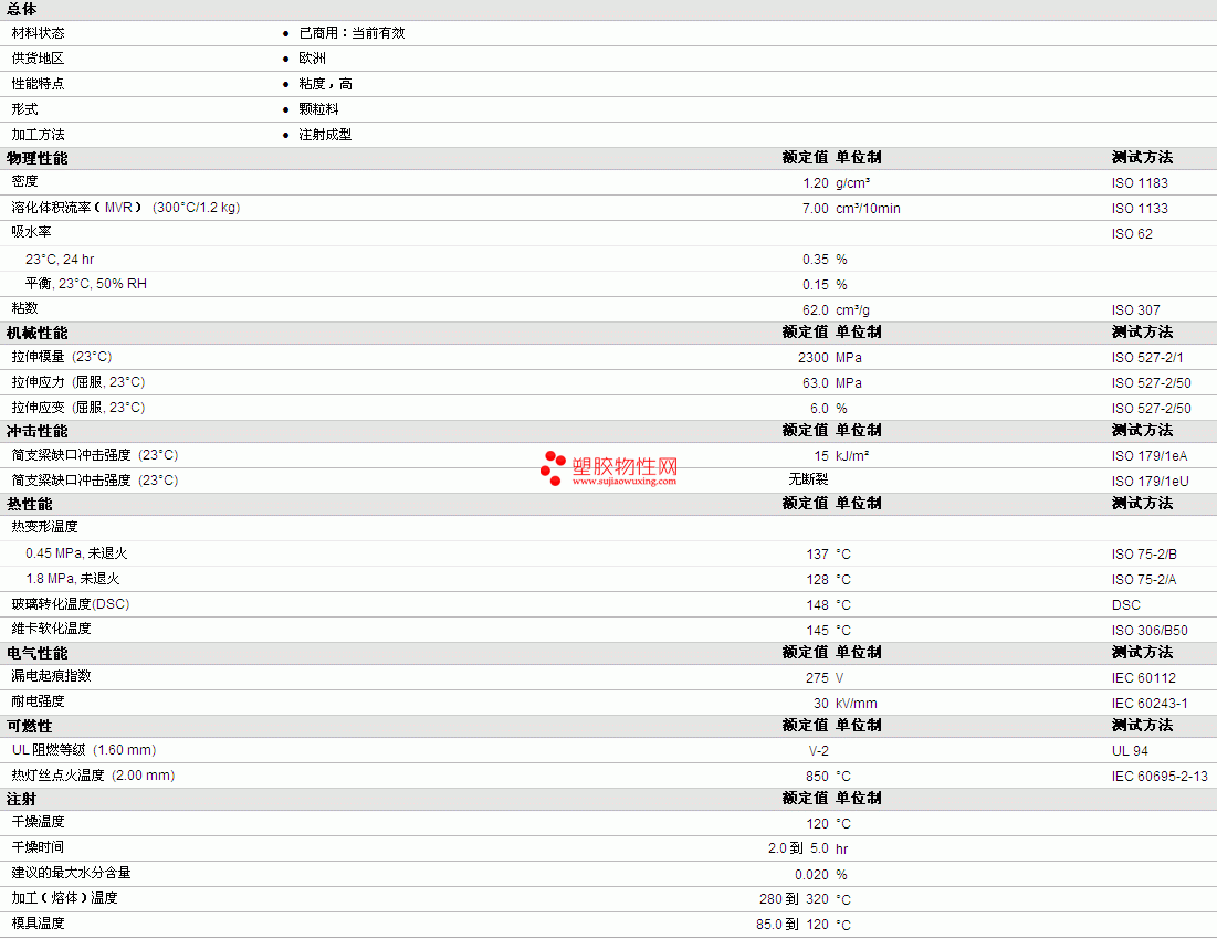 Anjalon PC J100Y 物性表详细情况如图