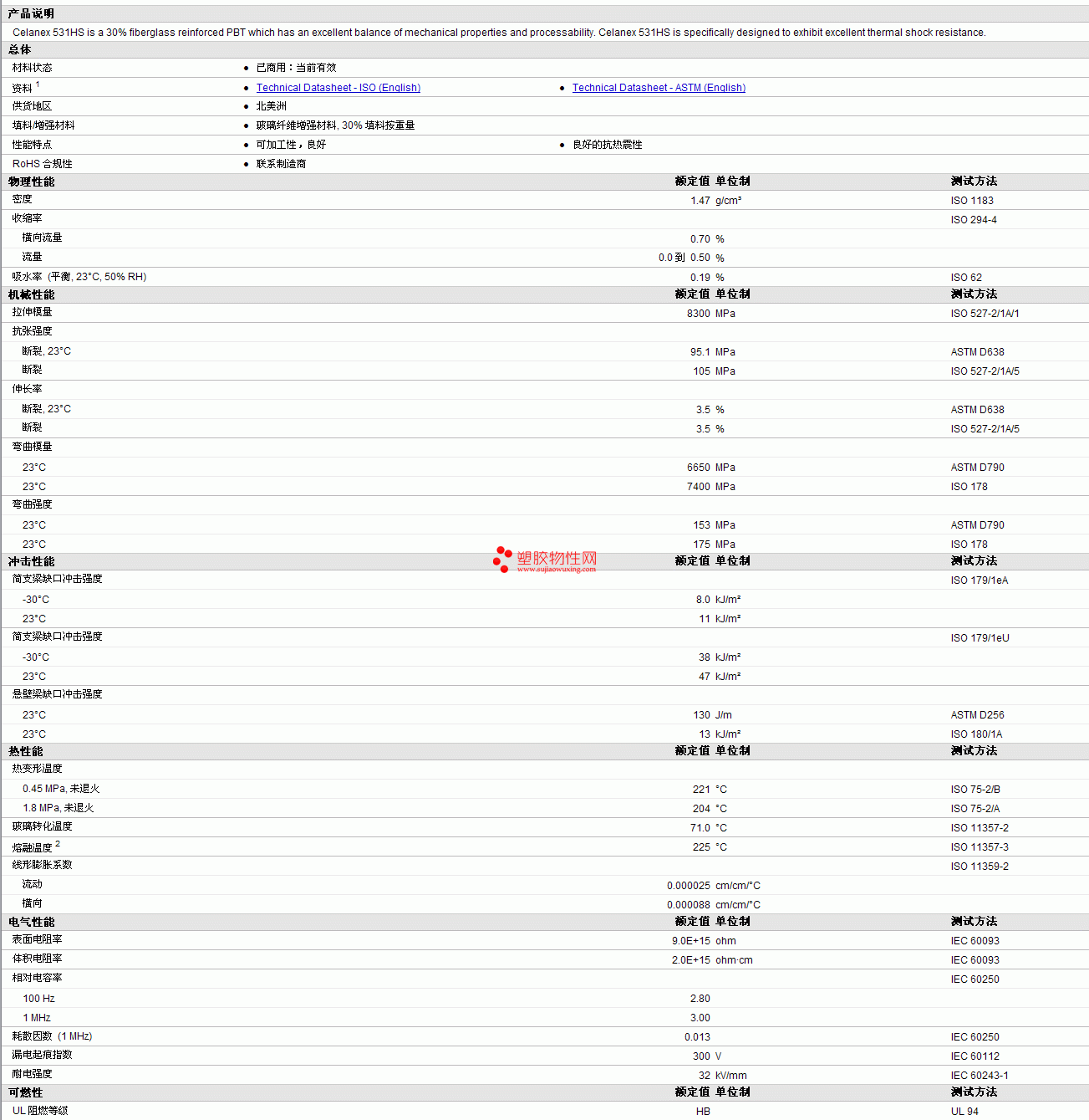 如需了解Celanex pbt 531HS物性表更多详情,ROHS(SGS)报告、、材质证明、UL黄卡等,最新行情报价等可来电咨询:赵先生:13424755533 QQ:27660005