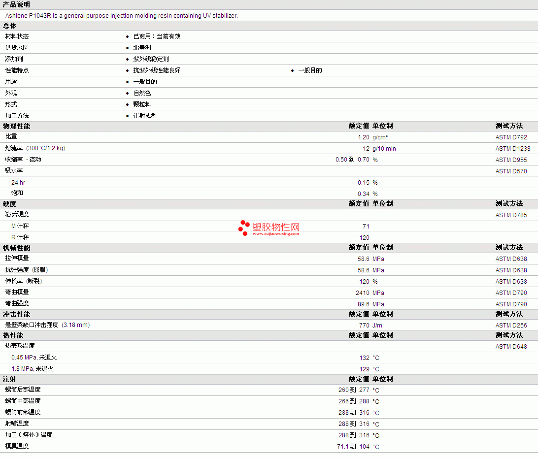 更多ASHLENE PC P1043R物性表图片,报价、物质安全资料表(MSDS)、材质证明、UL黄卡等,最新行情报价等可来电咨询或QQ:767320520
