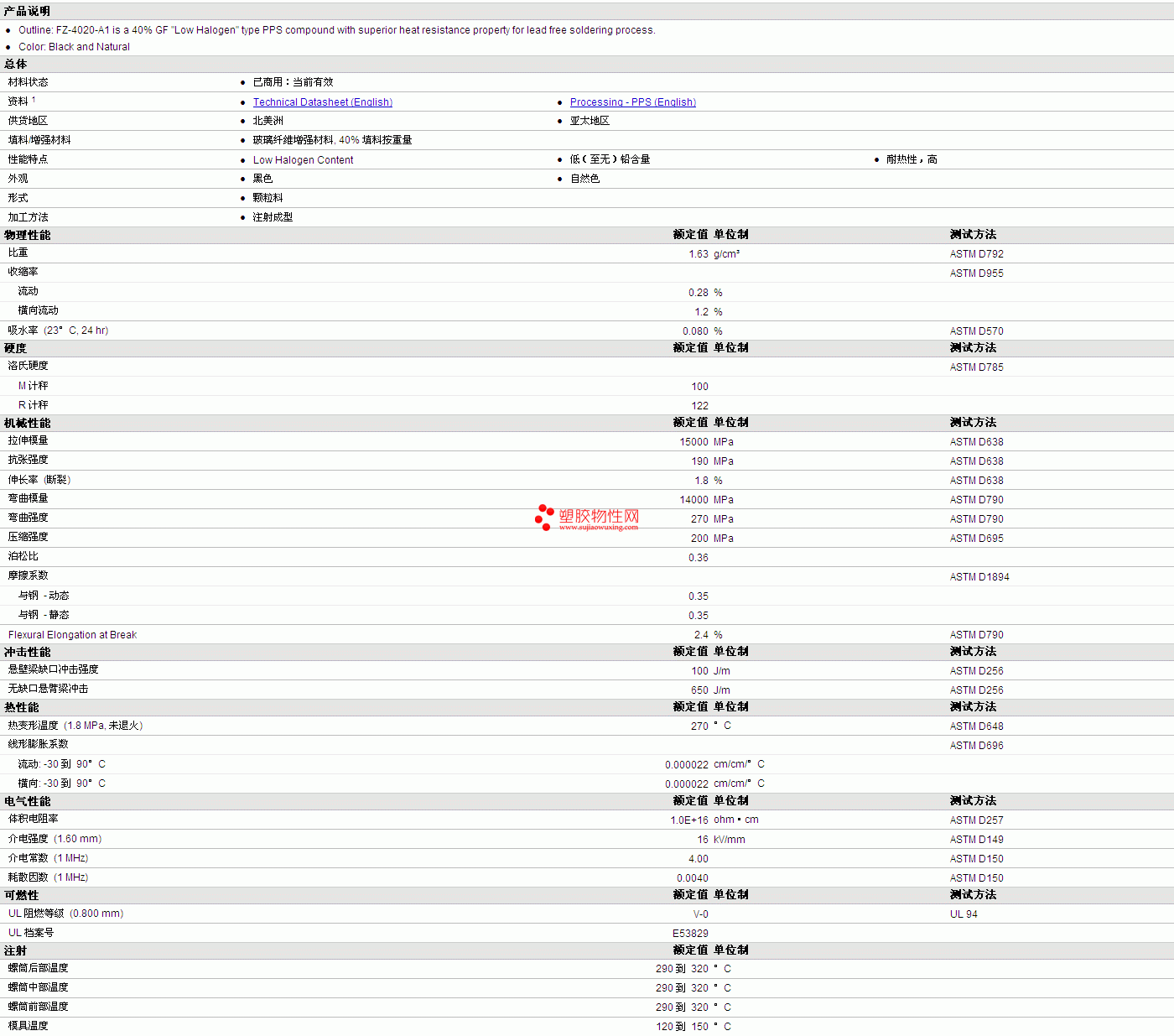 DIC.PPS FZ-4020-A1 物性表 详细情况如图