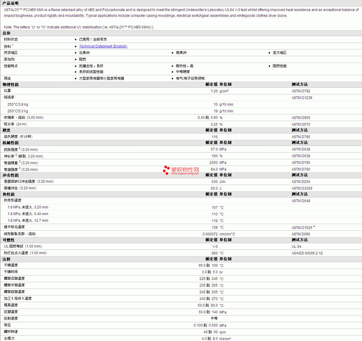ASTALOY PC/ABS KMA 物性表详细情况如图