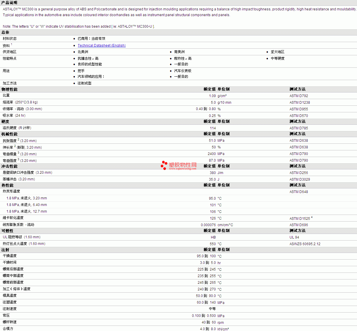需了解ASTALOY PC/ABS MC300物性表更多详情,ROHS(SGS)报告、图片、物质安全资料表(MSDS)、UL黄卡等,最新行情报价等可来电咨询或QQ:767320520