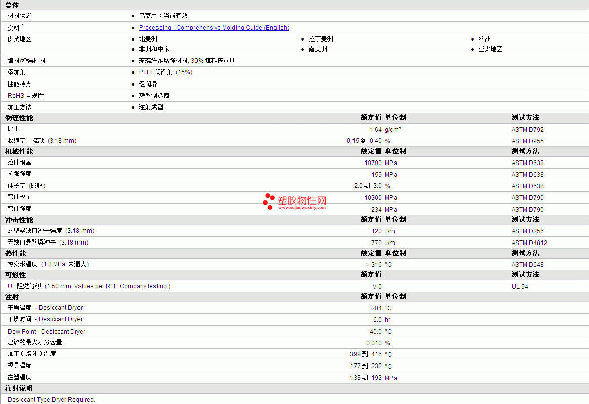 RTP Compounds PI 4205 TFE 15物性表如图所示