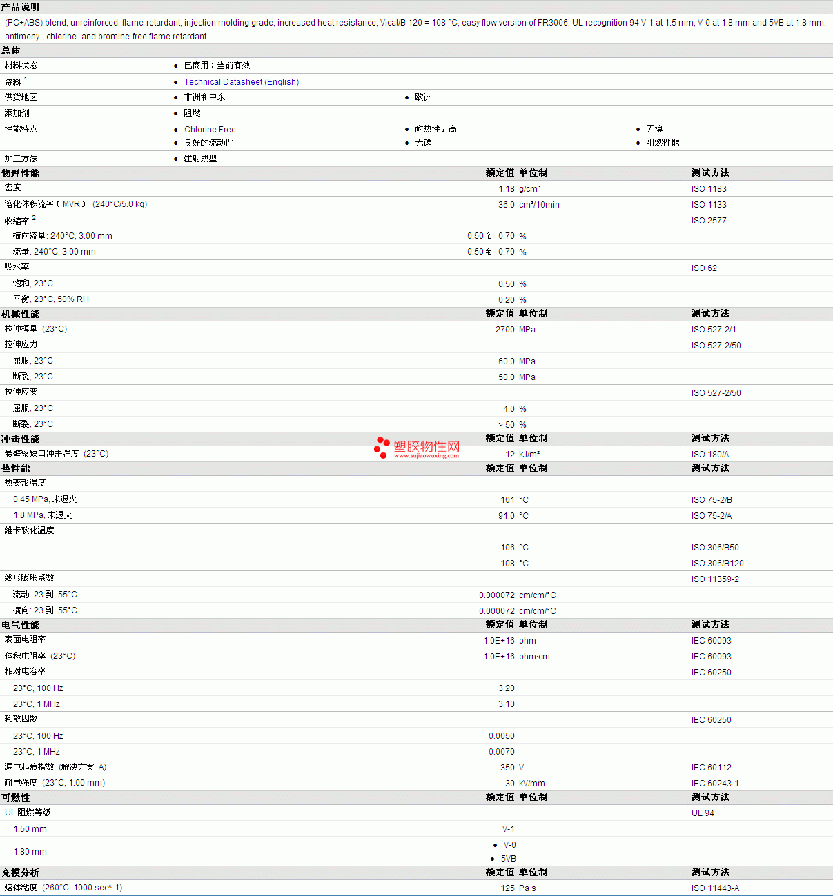 Bayblend ABS+PC FR3006 HF 物性表详细情况如图