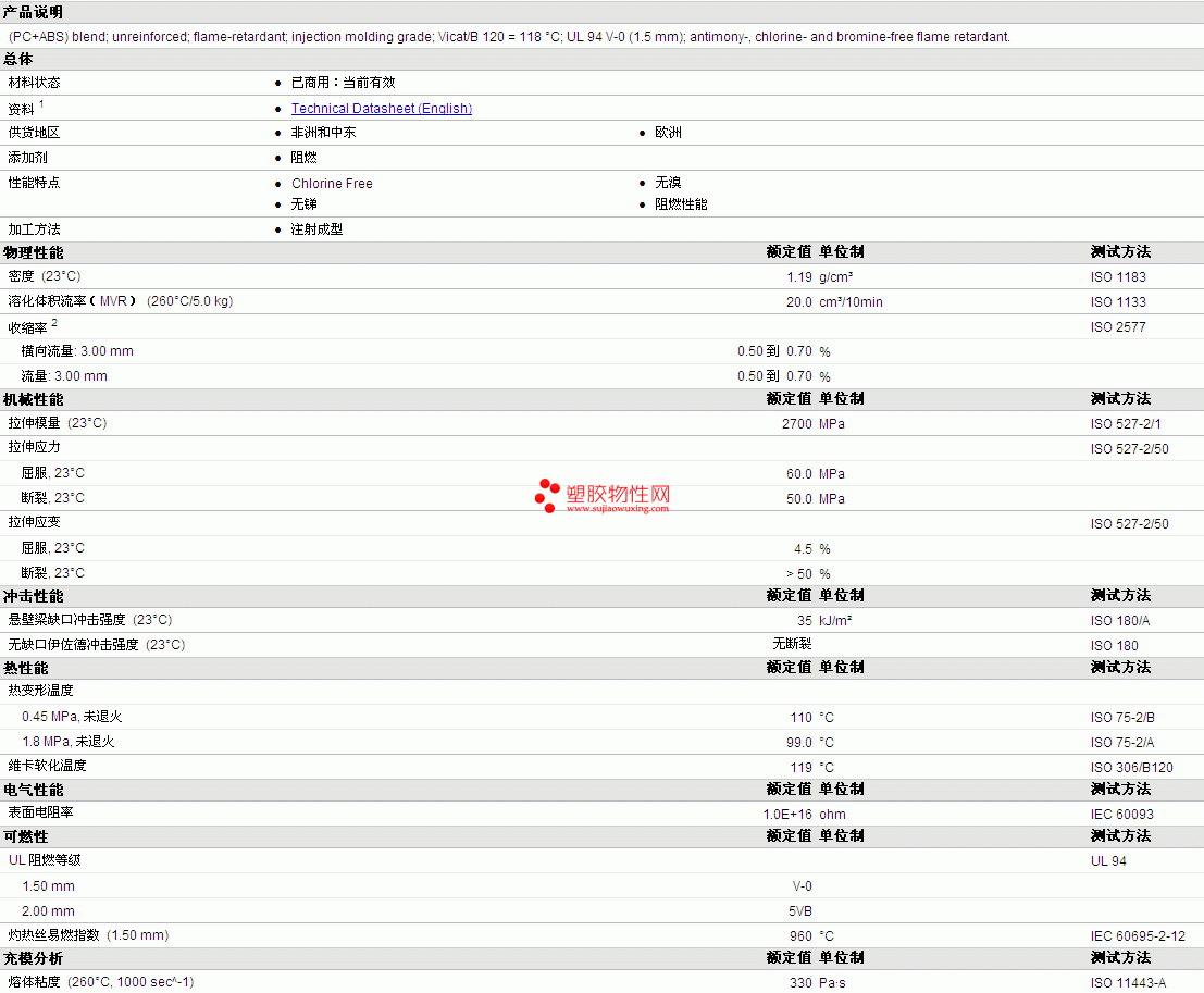 Bayblend ABS+PC FR3015物性表详细情况如图