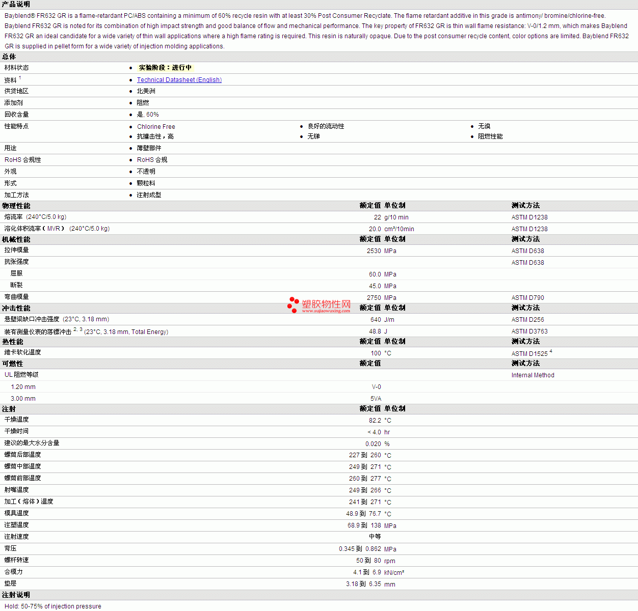 Bayblend ABS+PC FR632 GR 物性表详细情况如图