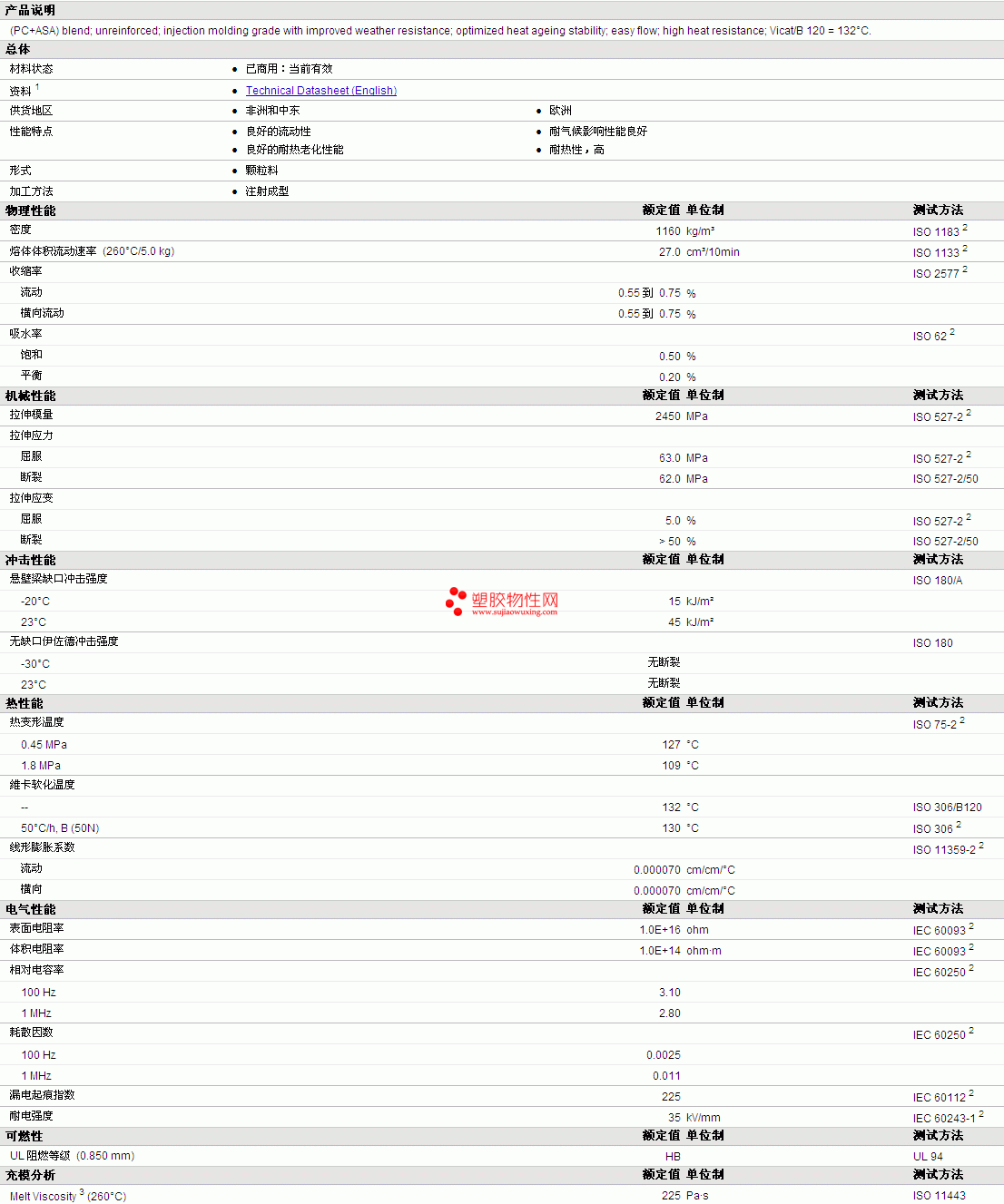 Bayblend ASA+PC W85 XF 物性表 详细情况如图