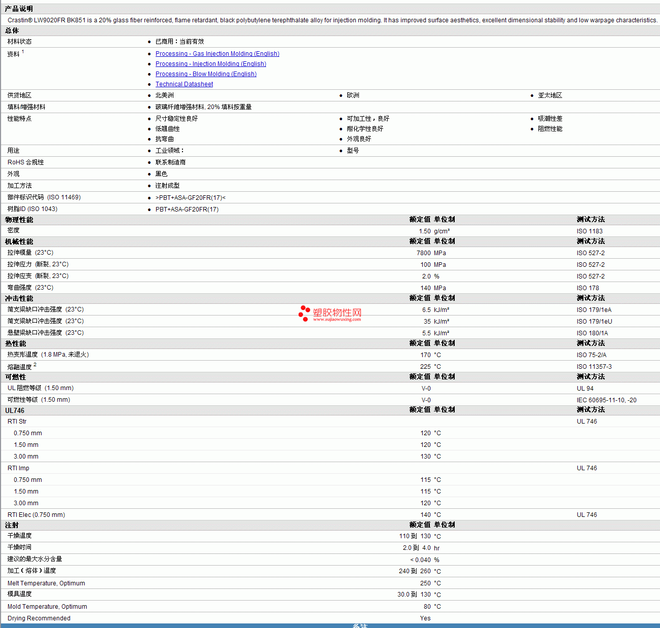 Crastin pbt LW9020FR BK851物性表详情如下图