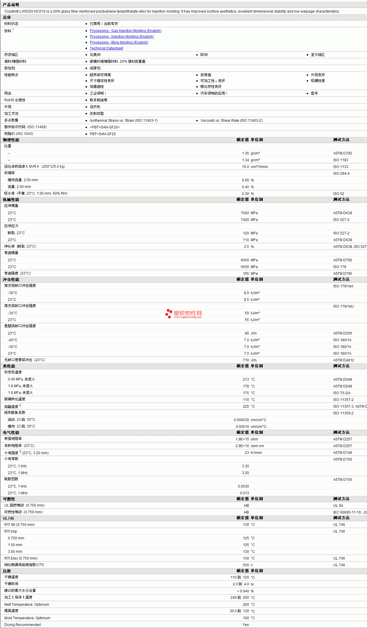 Crastin pbt LW9320 NC010 物性表详情如下图