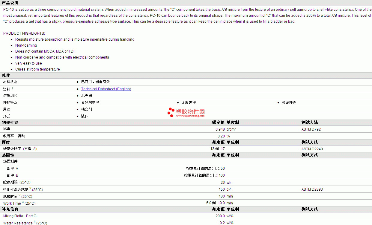 BJB Polyurethane TSU PC 10 物性表详细情况如图