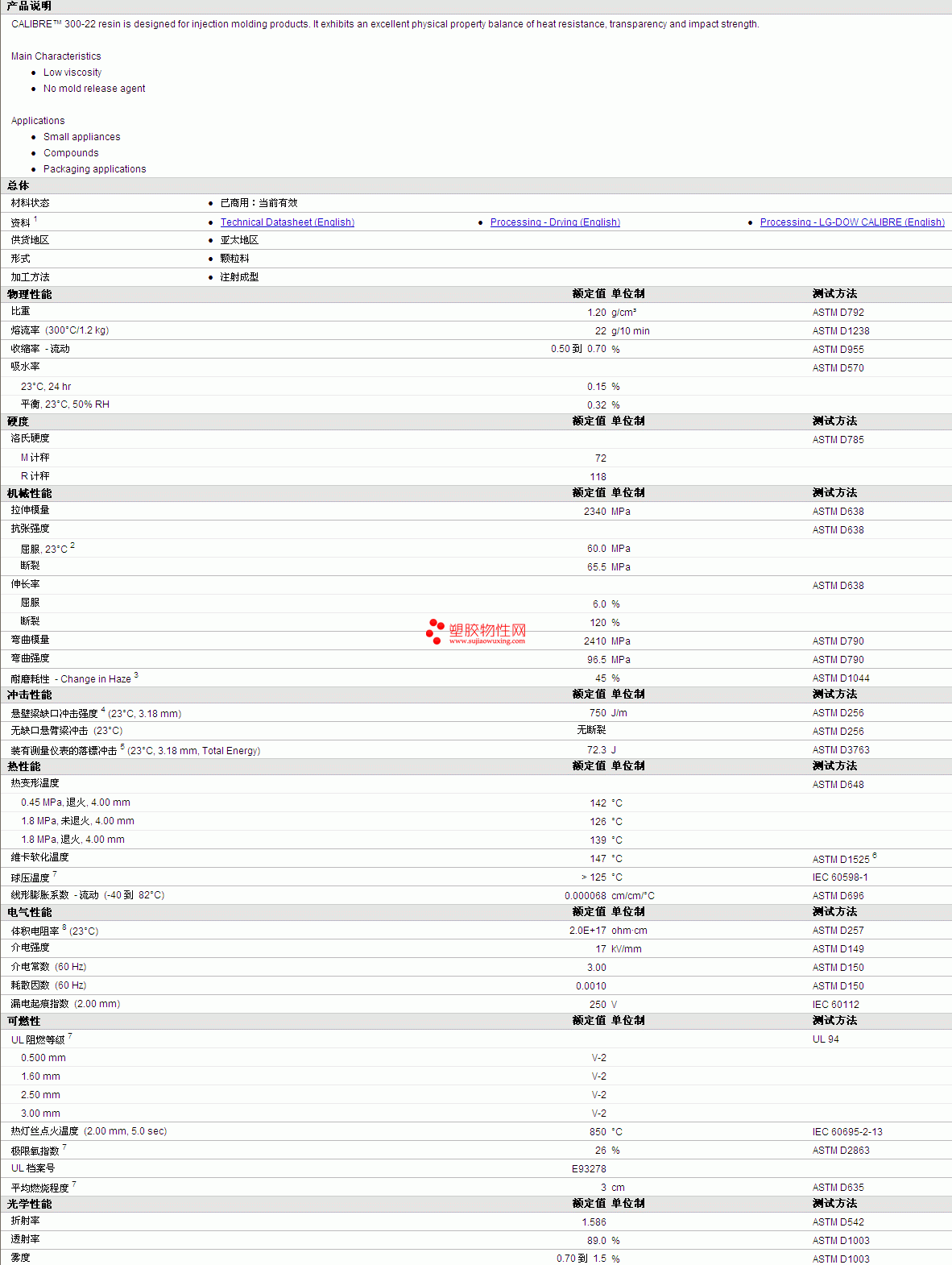 CALIBRE PC 300-22物性表如图所示