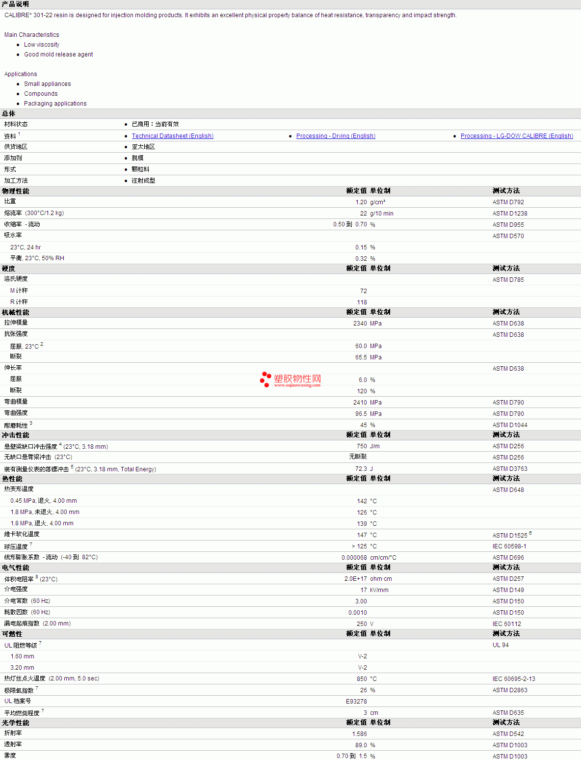 CALIBRE PC 301-22塑料更多详情,其他塑胶原料物性POM 100P、HIPS 475、LCP E130I可来电咨询或QQ:767320520