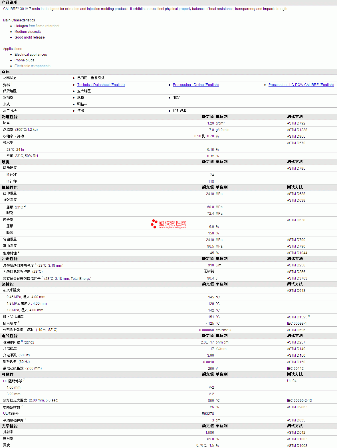 CALIBRE PC 301V-7塑料更多详情,其他塑胶原料物性POM 100P、HIPS 475、LCP E130I可来电咨询或QQ:767320520