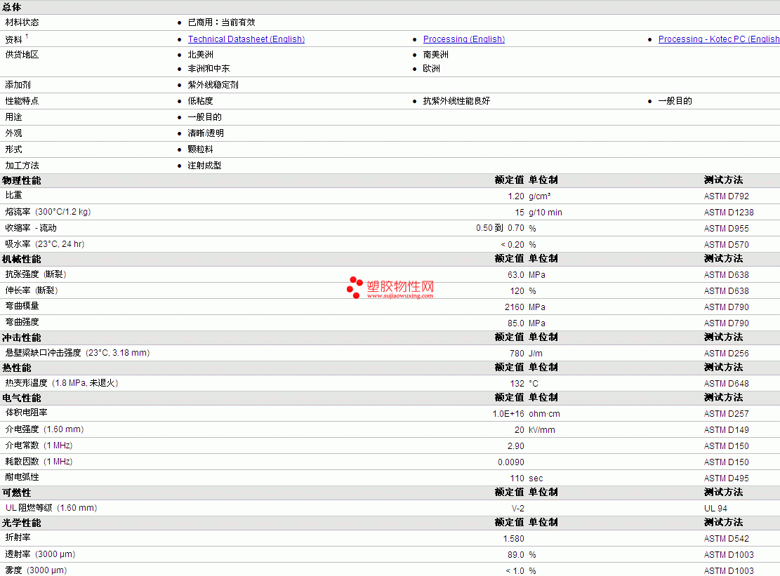如需Carbotex PC K-30UV塑料更多详情,其他塑胶原料物性尽在塑胶物性网,致电咨询或QQ:767320520