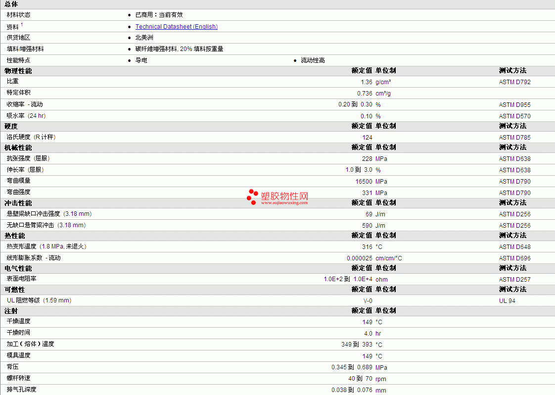 | 收缩率 - 流动 | 0.20 到 0.30 | % | ASTM D955 |