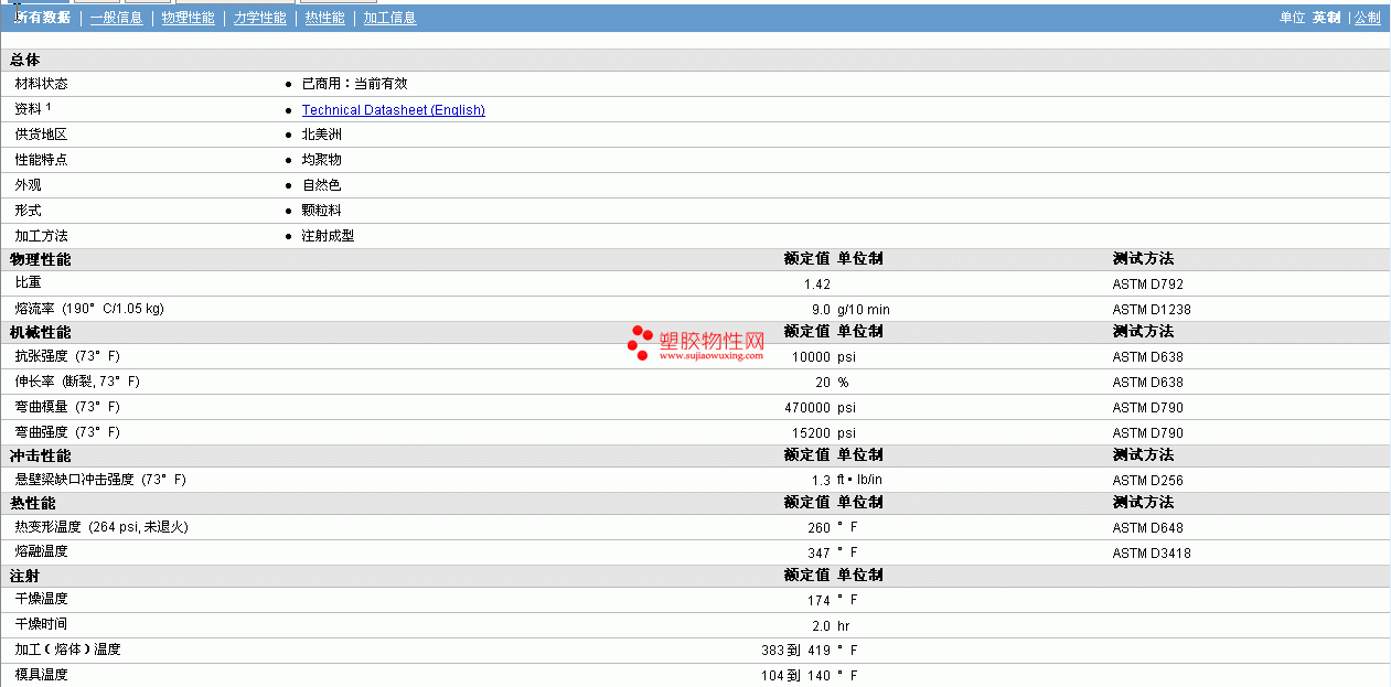 | 弯曲强度 (73°F) | 15200 | psi | ASTM D790 |
