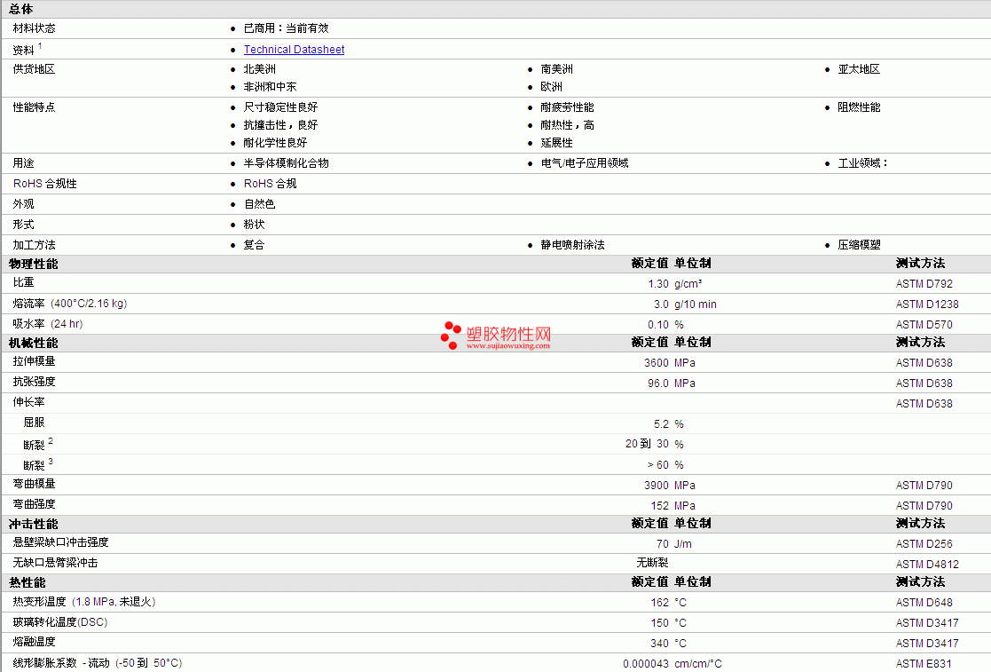 | 抗张强度 | 96.0 | MPa | ASTM D638 |