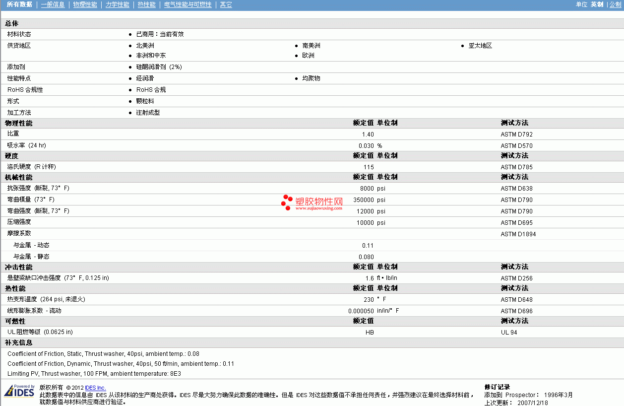 | 抗张强度 (断裂, 73°F) | 8000 | psi | ASTM D638 |