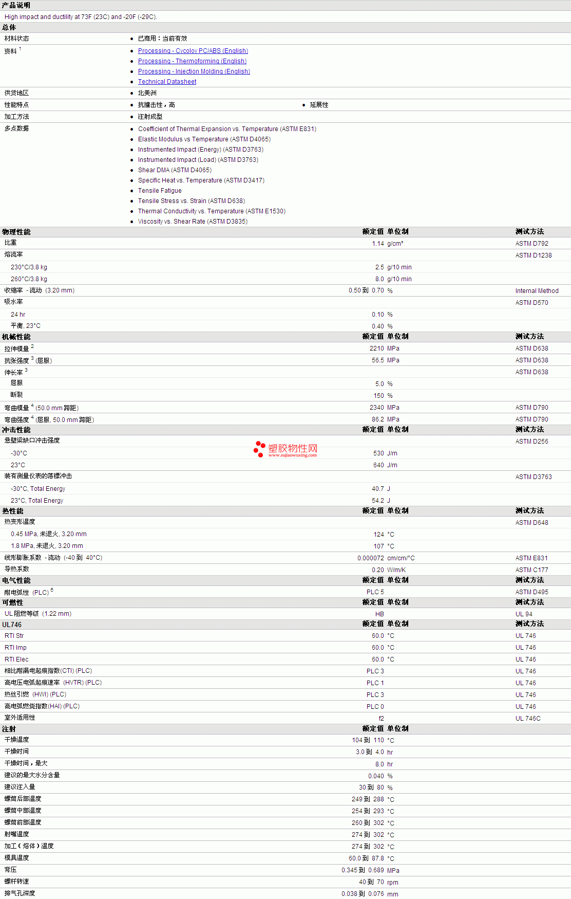 CYCOLOY ABS+PC C1110 Resin 物性表如图所