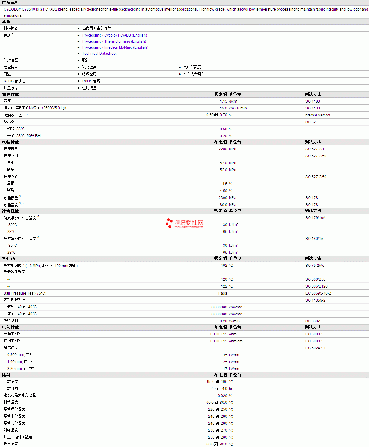 CYCOLOY ABS+PC CY8540 Resin 物性表详情见附件