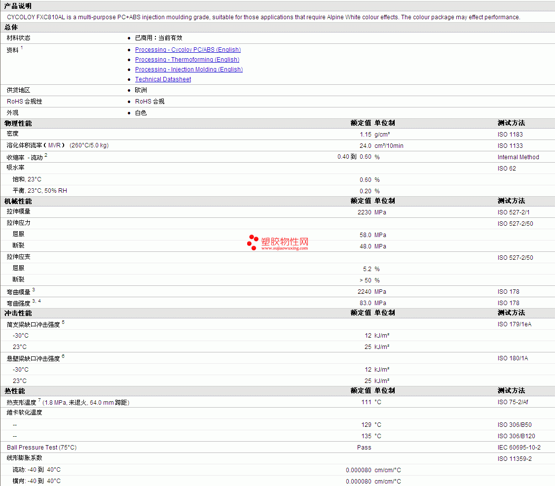 CYCOLOY ABS+PC FXC810AL Resin 物性表详细情况如图