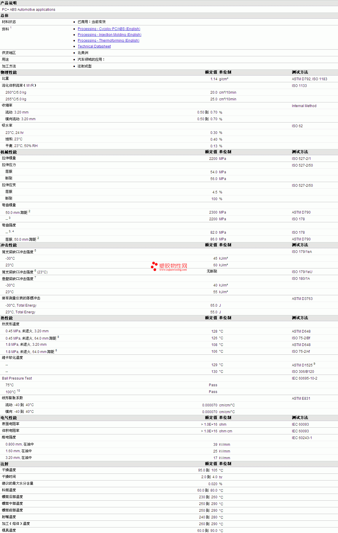 CYCOLOY ABS+PC XCY620S Resin 物性表更多资料见图