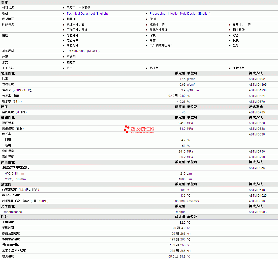 | 收缩率 - 流动 | 0.40 到 0.80 | % | ASTM D551 |
