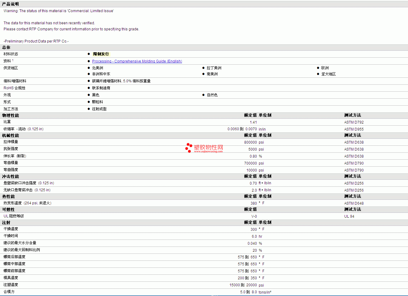 | 拉伸模量 | 800000 | psi | ASTM D638 |