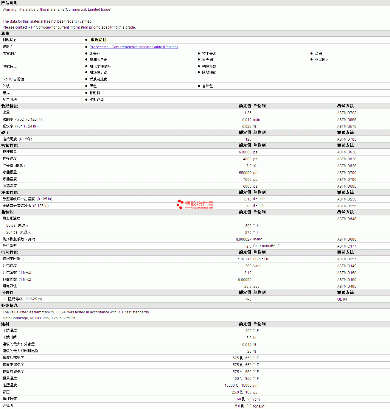 | 拉伸模量 | 630000 | psi | ASTM D638 |