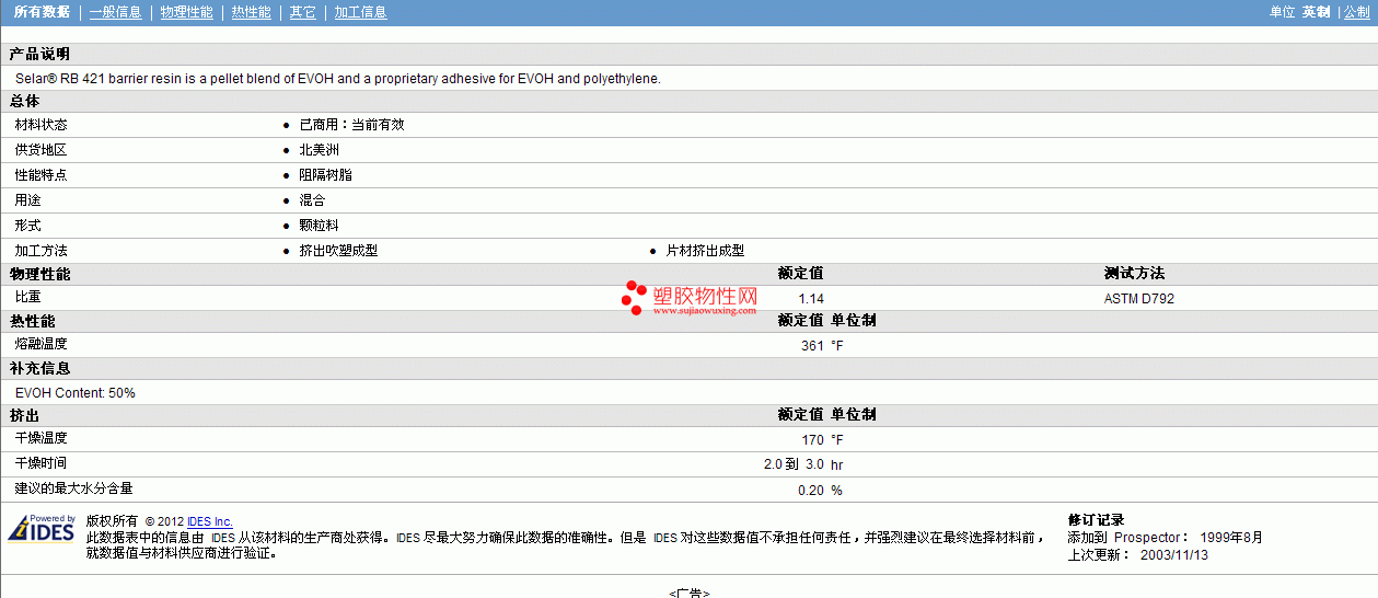 更多Selar EVOH RB 421物性表报价,图片、材质证明、UL黄卡、物质安全资料表(MSDS)等,最新行情报价等可来电咨询曾先生:18606048646或QQ:1078333107