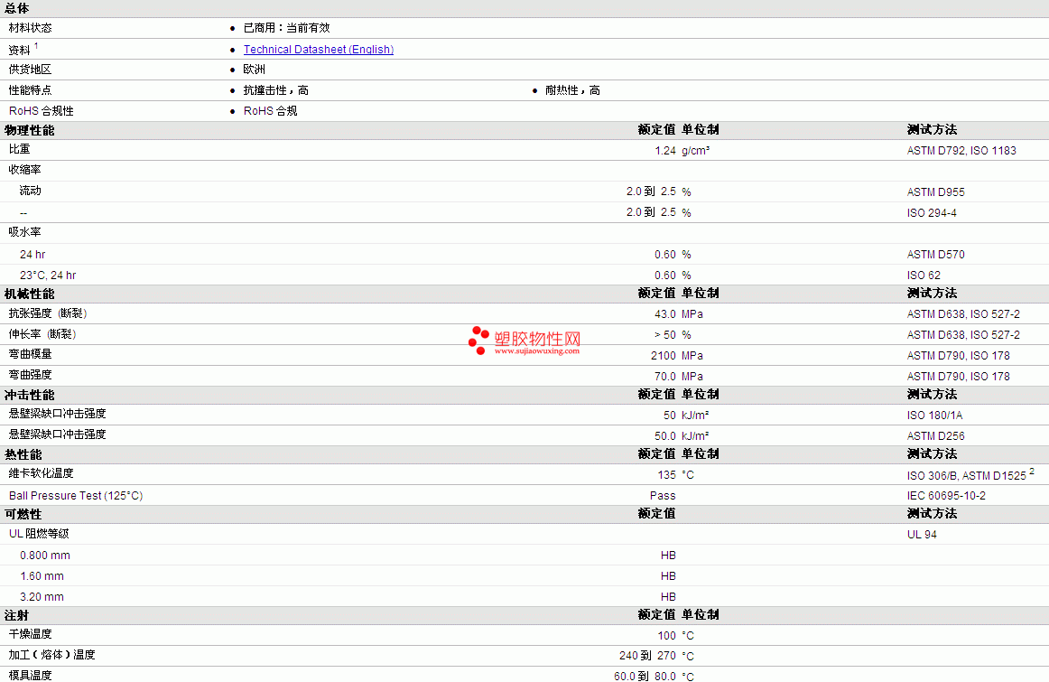| 机械性能 | 额定值 | 单位制 | 测试方法 |