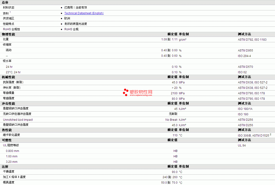 | 机械性能 | 额定值 | 单位制 | 测试方法 |