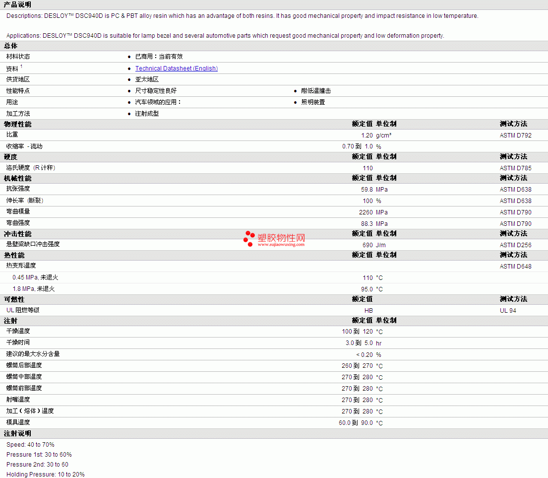 DESLOY PC+PBT DSC940D物性表详细情况如图