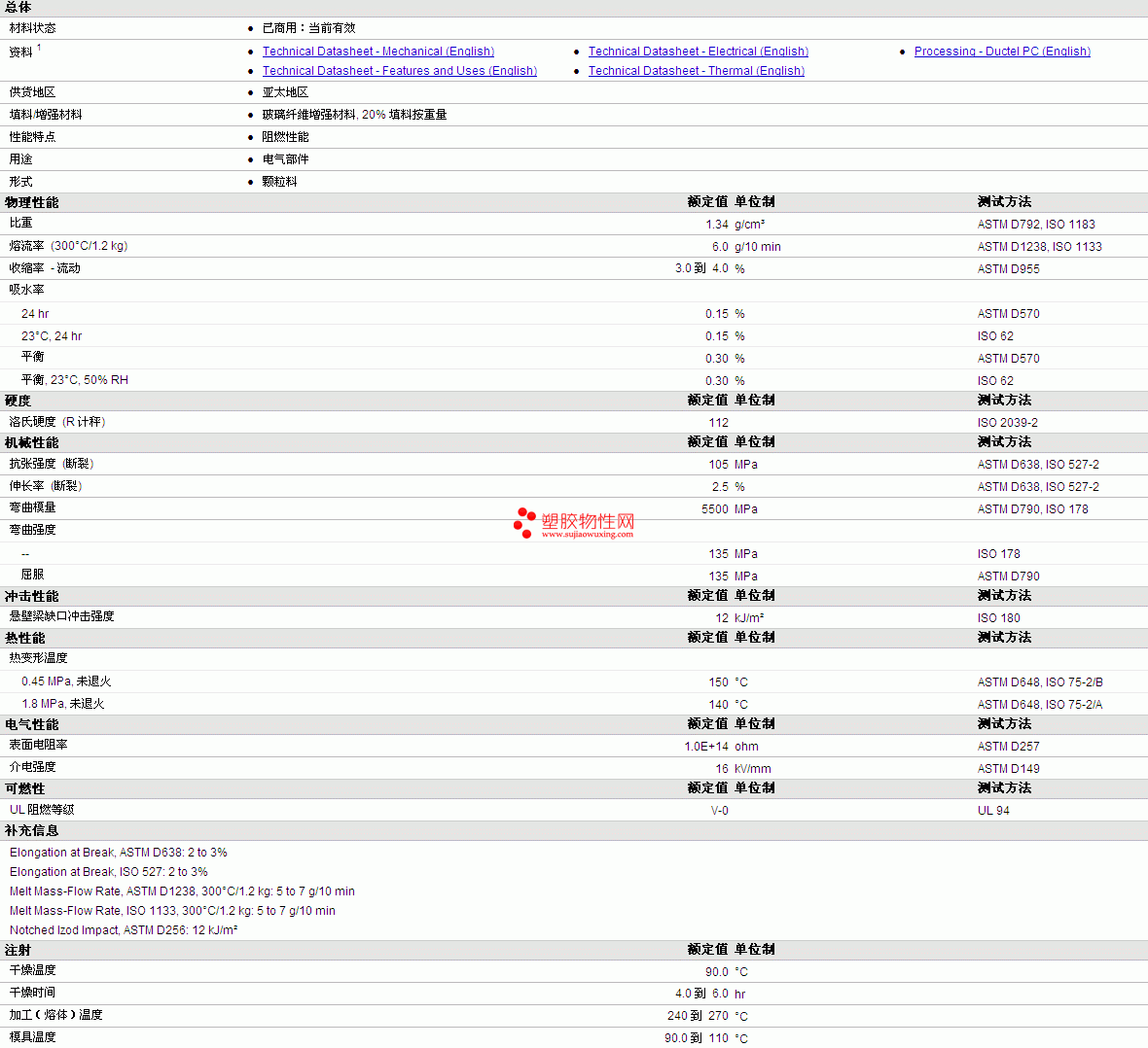 | 收缩率 - 流动 | 3.0 到 4.0 | % | ASTM D955 |