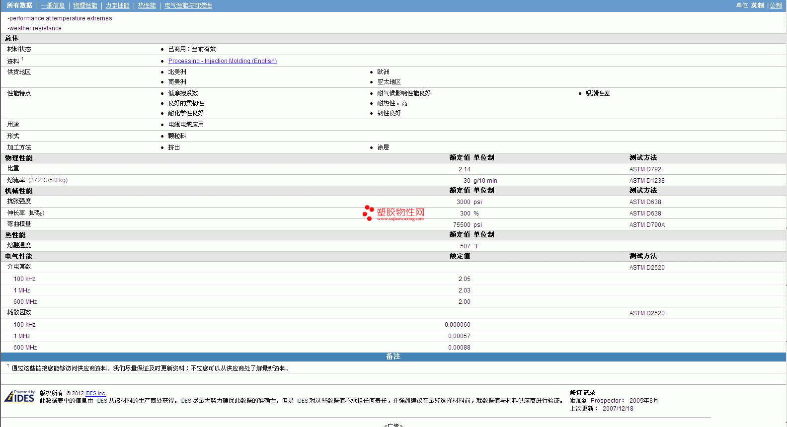 | 熔流率 (372°C/5.0 kg) | 30 | g/10 min | ASTM D1238 |
