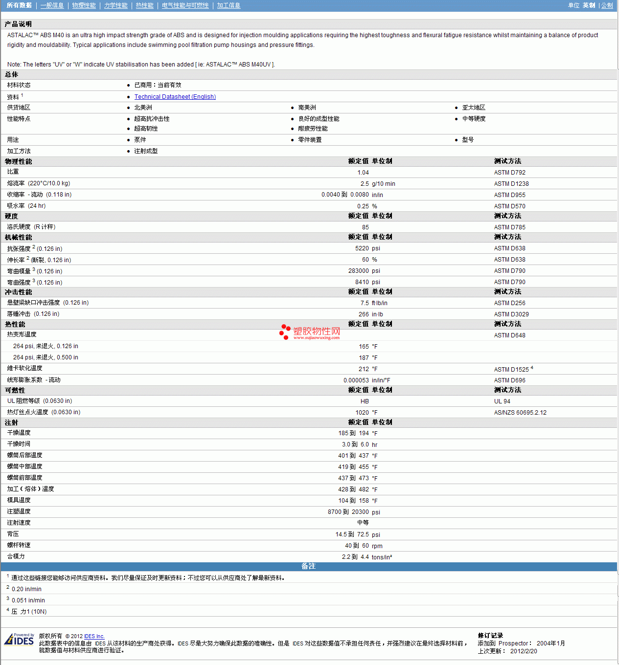 更多ASTALAC MABS ABS M40物性表报价,图片、材质证明、UL黄卡、物质安全资料表(MSDS)等,最新行情报价等可来电咨询曾先生:18606048646或QQ:1078333107