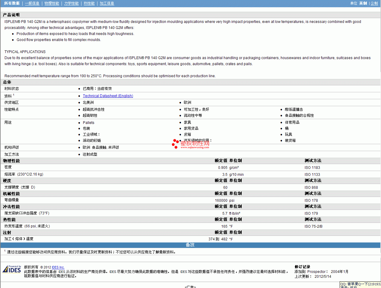 需了解ISPLEN PB 140 G2M物性表更多详情,材质证明、ROHS(SGS)报告、物质安全资料表(MSDS)、UL黄卡等,最新行情报价等可来电咨询:曾先生:18606048646 QQ:1078333107