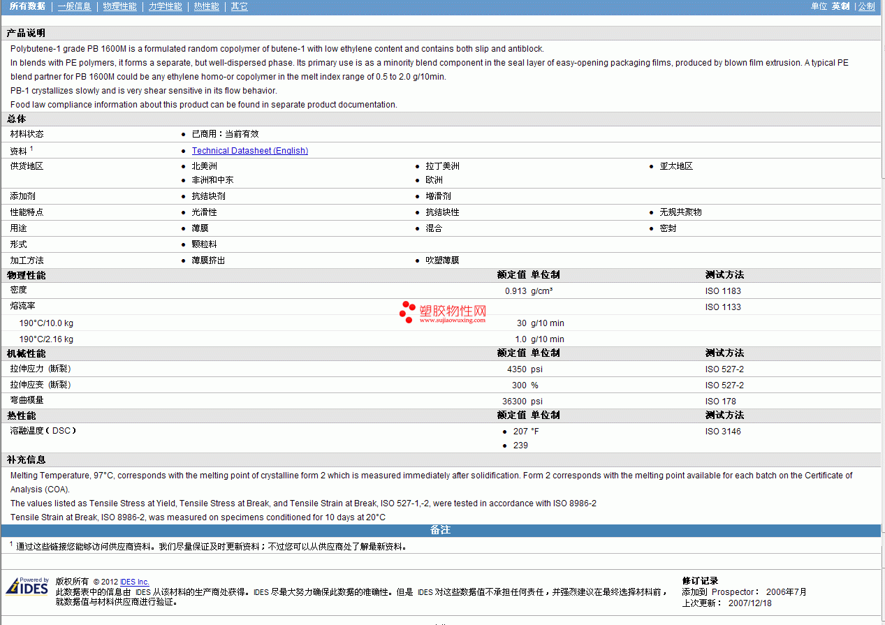 Polybutene-1 PB 1600M 物性表详细情况如图