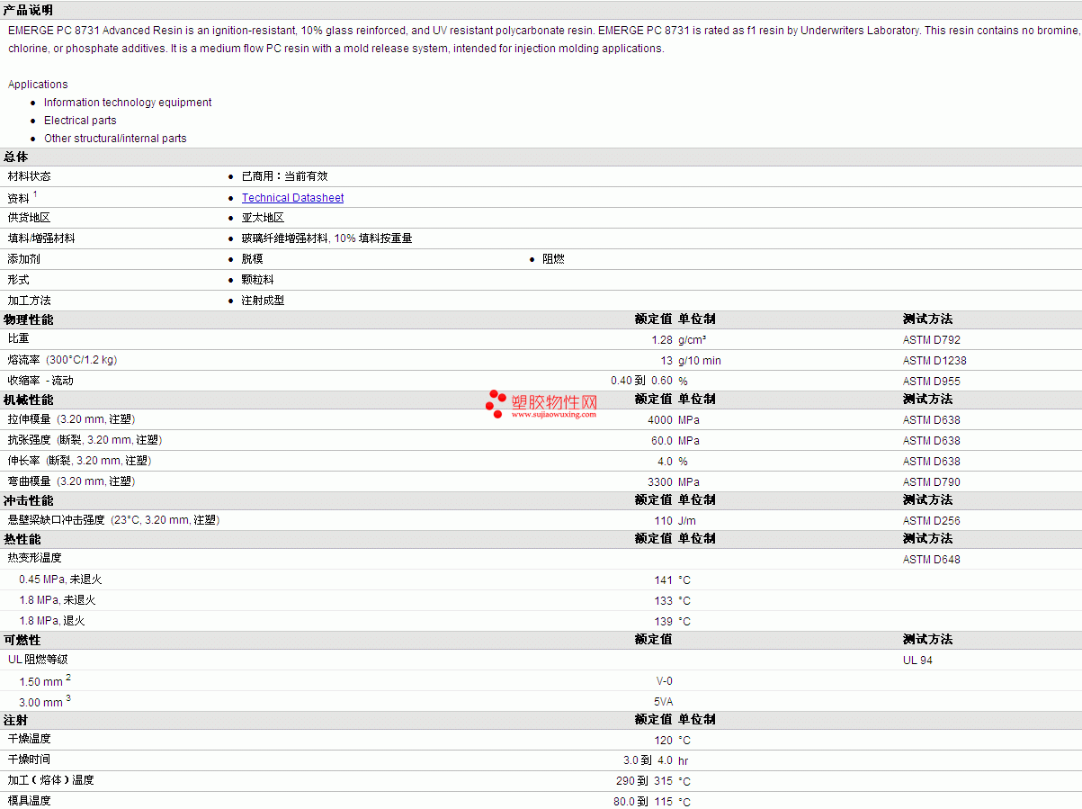 EMERGE PC 8731塑料更多详情,其他塑胶原料物性LCP E130I、PA9T GN2330、HIPS 475可来电咨询或QQ:767320520