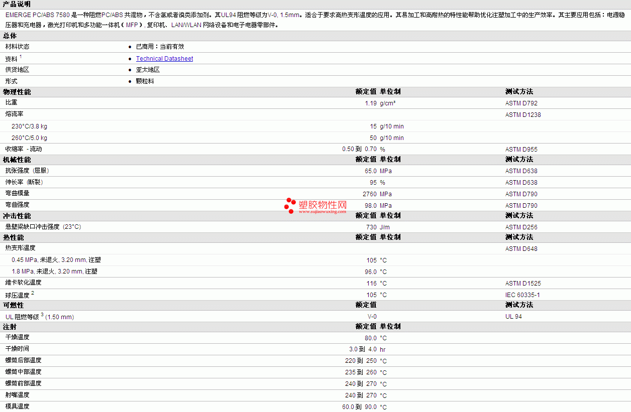 EMERGE PC/ABS 7580物性表如图