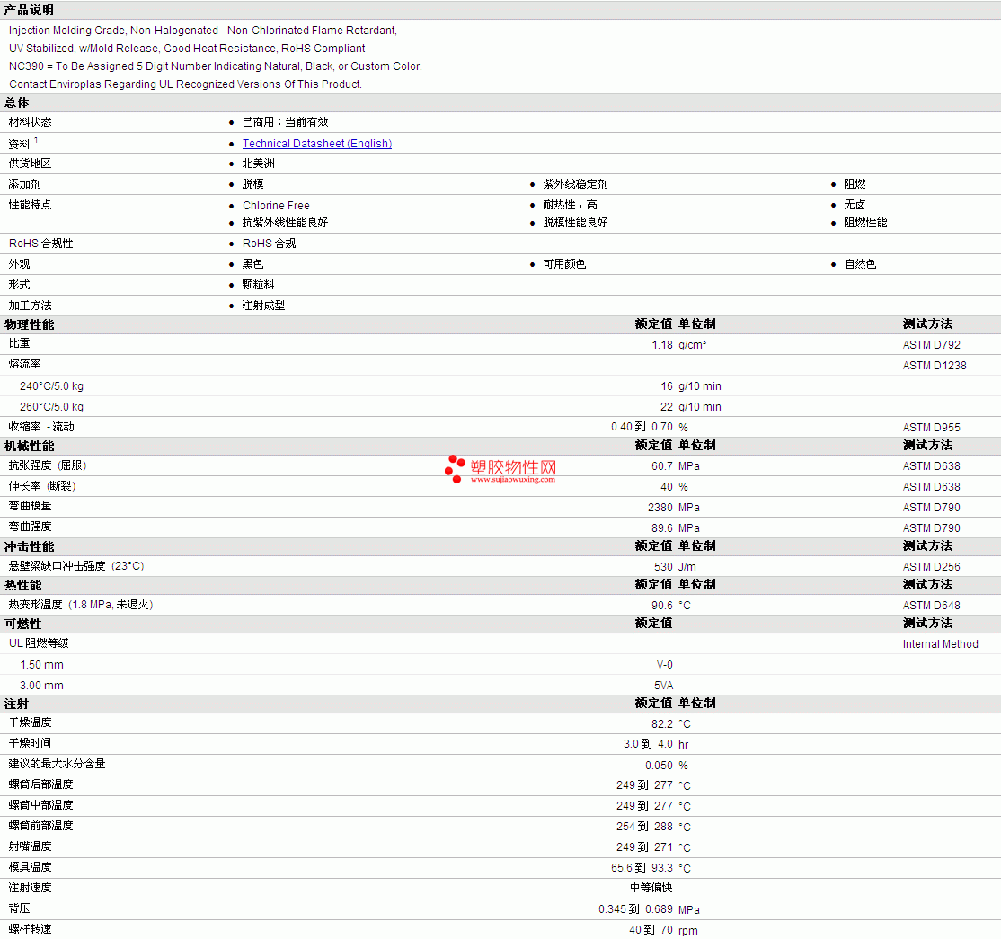 ENVIROLOY ABS+PC ENV15-NC390 物性表如图所示