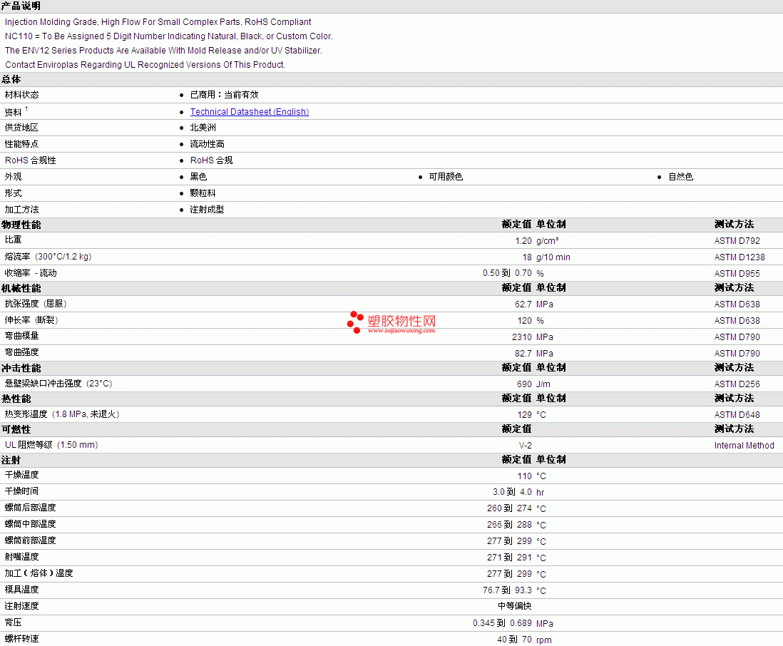 ENVIROPLAS PC ENV12-NC110物性表如图