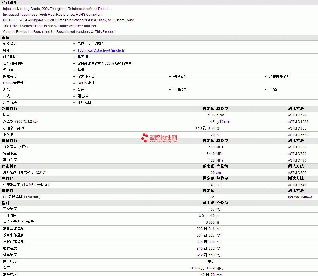 ENVIROPLAS PC ENV13-NC180 物性表详细情况如图