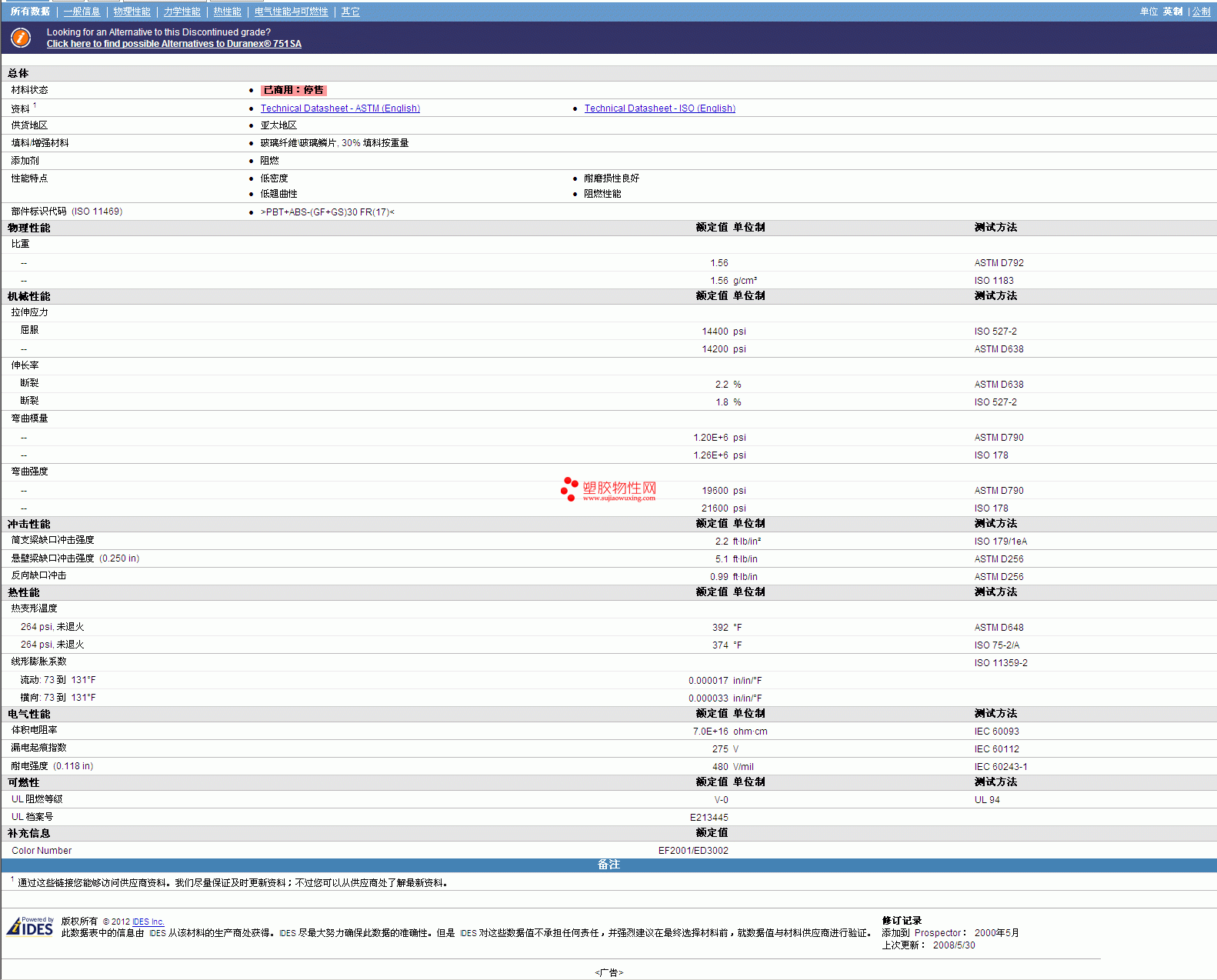 Duranex PBT/ABS 751SA物性表 详情见附件