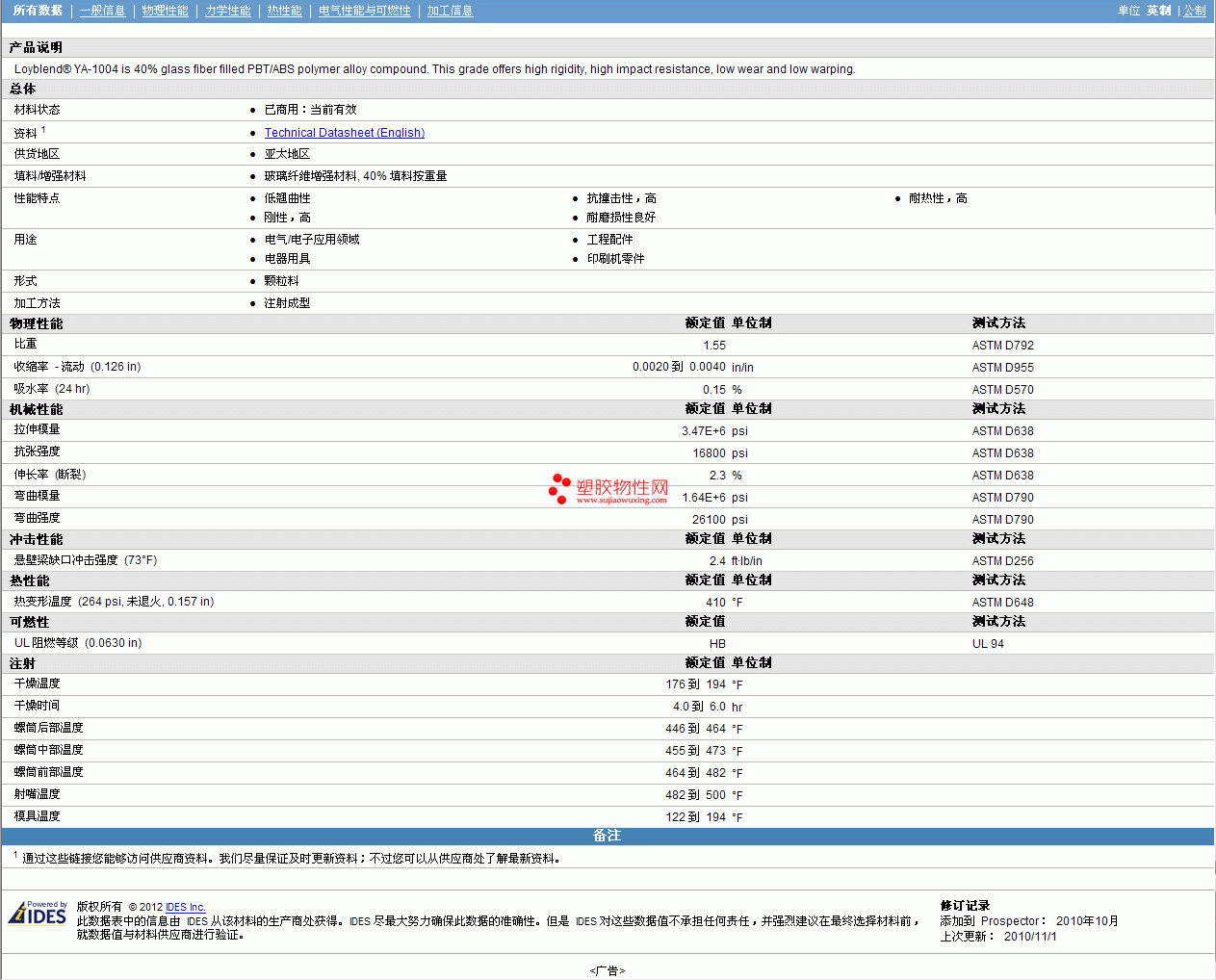 更多Loyblend PBT/ABS YA-1004物性表报价,图片、材质证明、UL黄卡、物质安全资料表(MSDS)等可来电咨询赵先生:13424755533 或QQ:27660005