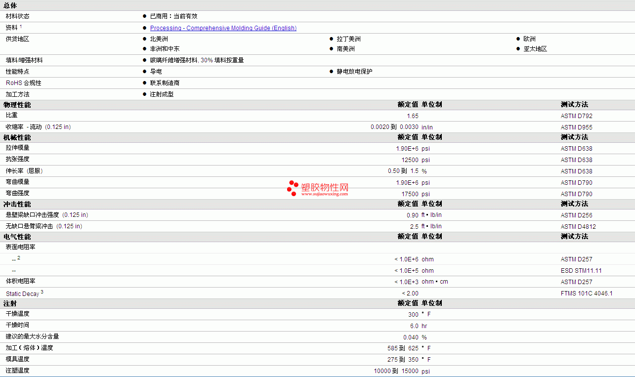 | 收缩率 - 流动 (0.125 in) | 0.0020 到 0.0030 | in/in | ASTM D955 |