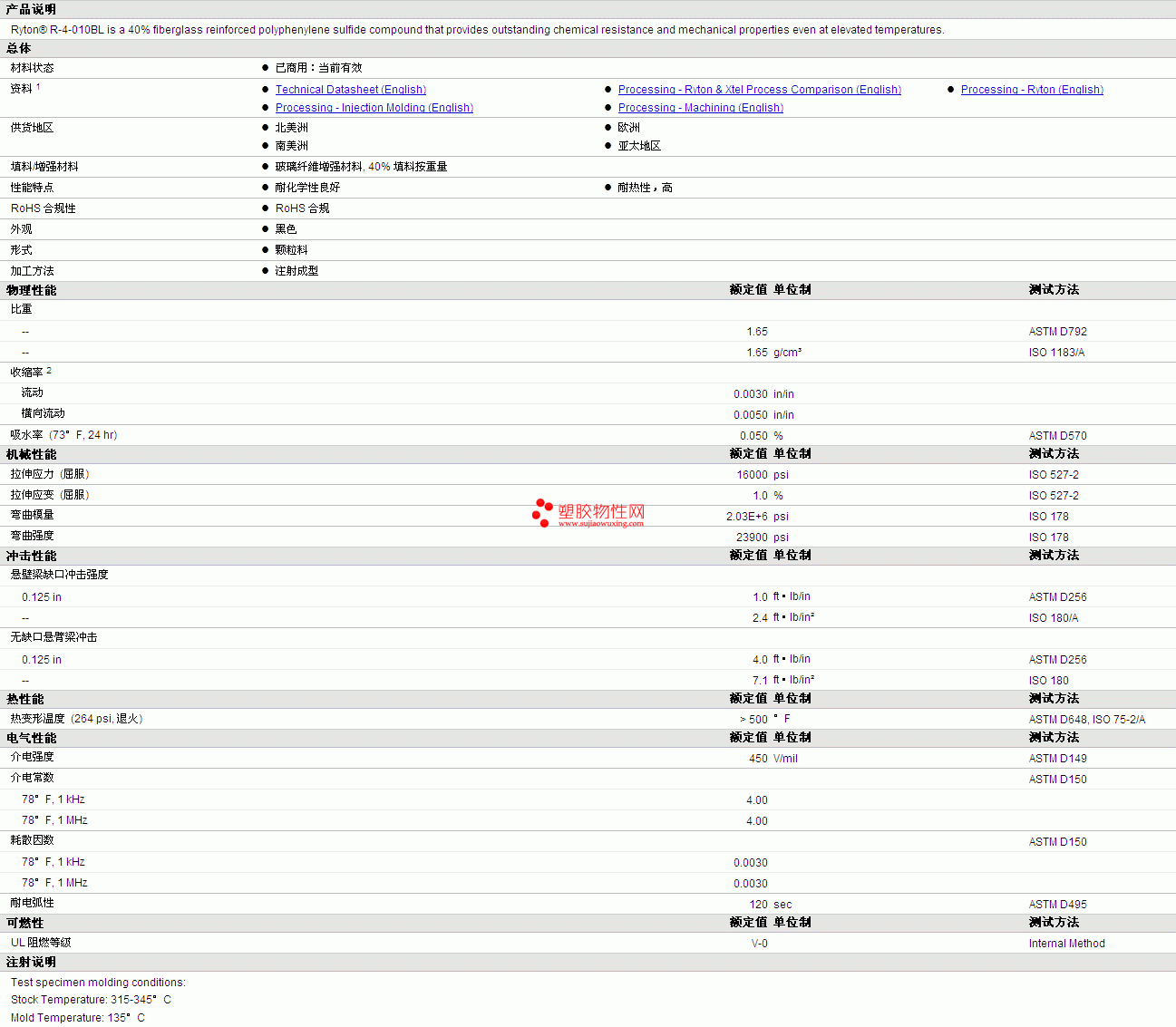 更多Ryton PPS R-4-010BL,物性表报价,图片、材质证明、UL黄卡、物质安全资料表(MSDS)等,最新行情报价等可来电咨询或QQ:767320520