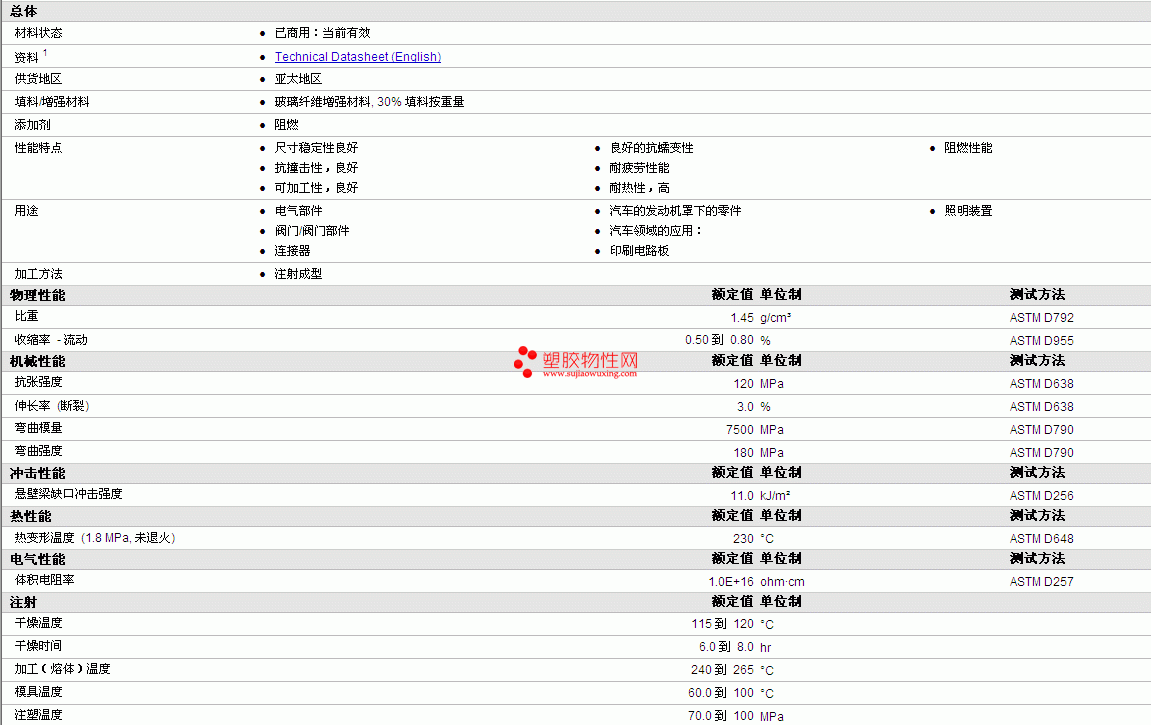| 弯曲强度 | 180 | MPa | ASTM D790 |